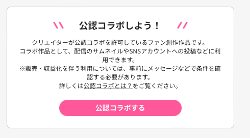 条件を確認してお互いの合意の上で販売・収益化を行った上で、作品に公認コラボマークをつけてください。